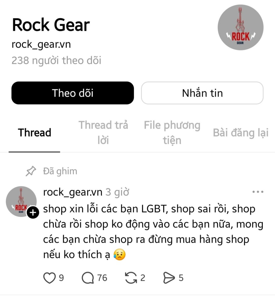 Cuộc tranh cãi bắt đầu khi một tài khoản trên mạng xã hội Thread có tên @rock_gear.vn, được cho là của cửa hàng Rock Gear, đã đăng tải những bình luận với ngôn từ hung hăng, mang tính xúc phạm và công khai bày tỏ quan điểm kỳ thị đối với cộng đồng LGBTQ+.